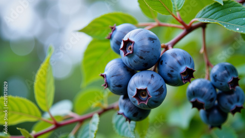Vibrant blueberries glistening on branch in lush forest, nature's bounty