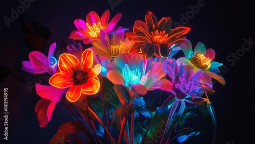 Vibrant bouquet of glowing flowers in neon hues