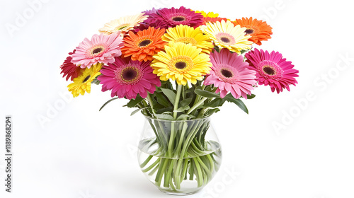 gerbera daisy, flower, bouquet, colourful, many-coloured, pink, yellow, orange, red, white, vase, floral arrangement, bloom, blossom, bright, cheerful, spring, summer, decoration, gift, present, celebration, love, romance, beauty, nature, plant, fresh, high-coloured, vibrant, flower petals, closeup, macro, isolated, background, white background, studio shot, photo, image, flora, botanical