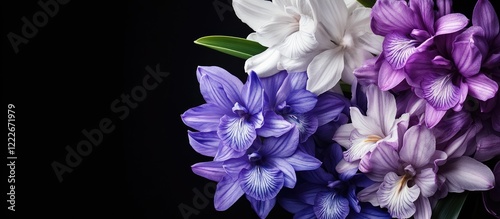 orchid, bouquet, vibrant, purple, white, black, background, green, leaf, contrast, striking, floral, plant, nature, beauty, arrangement, decoration, exotic, flower petals, colours, elegance, garden, style, fresh, flora, composition, art, design, luxury, tropical, high-coloured, softness, interior, aesthetic, contemporary, appealing, visual, closeup, botany, theme, texture, organic, flower, lush, shadow, detail