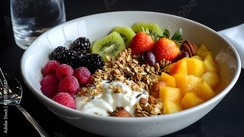 Vibrant Breakfast Bowl Featuring Colorful Fruits Nuts and Granola for Healthy Dining