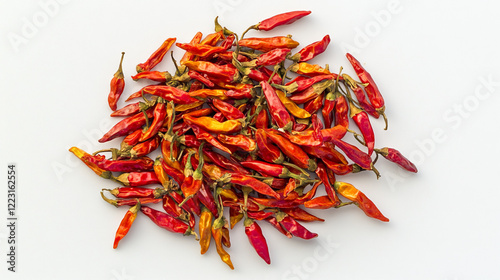 Vibrant bunch of red and orange dried chili peppers on a white background