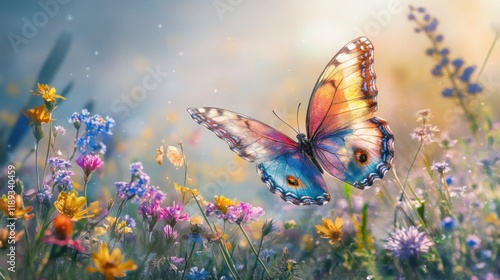 Vibrant Butterfly in a Summer Meadow: A Serene Scene of Colorful Flowers and Gentle Sunlight