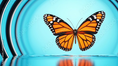 vibrant butterfly with orange and black wings gracefully hovers above serene blue water surface, creating tranquil atmosphere