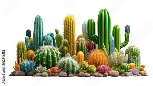 Vibrant Cactus Collection: A striking display of diverse cactus plants with various shapes, sizes, and hues. The image showcases the beauty of these resilient desert dwellers.