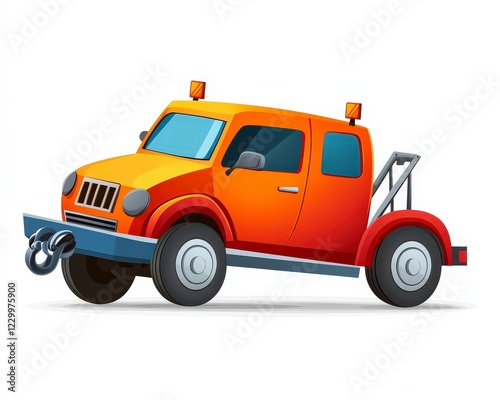 cartoon, pickup, truck, vehicle, winch, safety, light, orange, red, design, graphic, illustration, transportation, tow, model, flat, mechanism, bright, fun, engine, wheel, icon, transport, delivery, outdoors, driving, adventure, construction, service, utility, modern, art, style, creative, vector