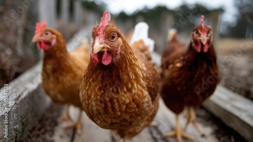 Vibrant chickens exploring a rustic farmyard on a chilly afternoon