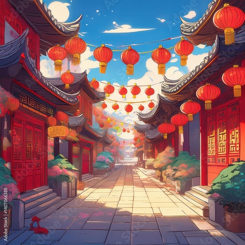 Vibrant China Anime Style Alley Transformed for Chinese New Year, Vivid Colors and Detailed Patterns Illuminating a Festive Mood in the Heart of Traditional China, Embracing Cultural Celebration