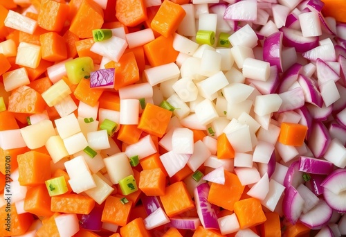 Vibrant chopped onions, carrots, & celery, close-up studio shot, detail, kitchen