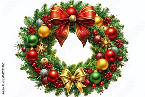 Vibrant Christmas Wreath Clipart: Red Bow, Gold & Silver Decorations, Detailed Illustration