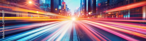 Vibrant city light trails create a dynamic sense of motion and energy in an urban landscape at dusk.