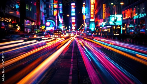 Vibrant city lights and motion blur create a dynamic urban landscape at night.