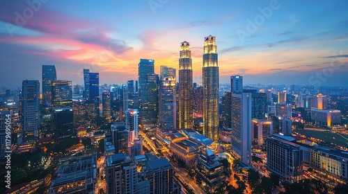 Vibrant City Skyline at Dusk Featuring Towering Skyscrapers and Illuminated Streets in an Urban Landscape