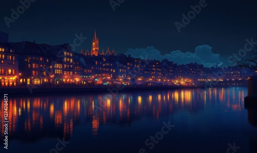 Vibrant city skyline at night, glowing windows and streetlights reflecting on a nearby river, evoking an urban energ