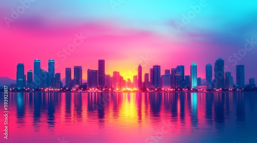 city, skyline, sunset, sunrise, urban, building, skyscraper, city landscape, water, pink, purple, blue, light, glow, colours, evening, night, horizon, architecture, modern, contemporary, metropolis, sea, ocean, coastal, tranquil, calm, peaceful, vibrant, beautiful, scenic, view, panorama, background, image, illustration, design, graphic, abstract, art, summer, travel, tour tourism, vacation, holiday, dream, fantasy