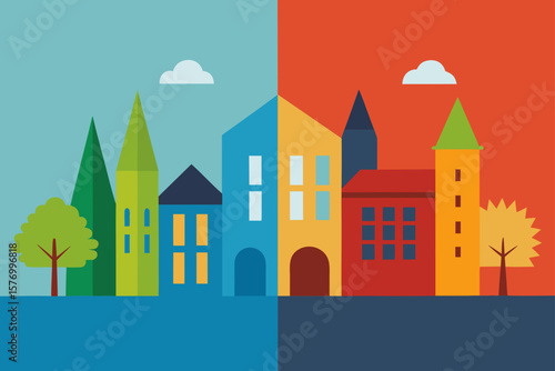 Vibrant Cityscape A Colorful Contrast of Seasons and Architecture