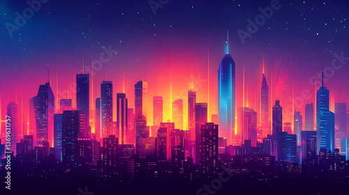 city landscape, city, skyline, urban, night, building, architecture, light, downtown, skyscraper, evening, modern, city lights, dark, scene, scenic, glow, bright, futuristic, metropolis, illuminated, abstract, purple, orange, blue, landmark, exterior, structure, panorama, background, horizon, travel, tour tourism, district, center, vibrant, retro, sunset