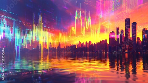 city, skyscraper, sunset, water, urban, digital, datum, night, evening, modern, technology, futuristic, graphic, colourful, vibrant, bright, light, glow, skyline, building, architecture, landscape, scene, image, art, illustration, design, abstract, visual, graphic, composition, style, colours, tonality, texture, dynamic, overlay, high-coloured, intense, expression