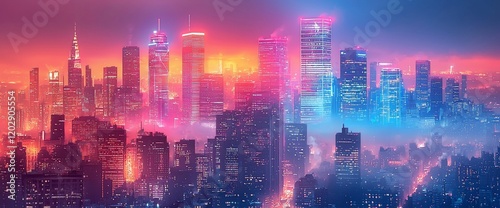 city, skyline, urban, building, skyscraper, metropolis, downtown, night, light, glow, fog, mist, haze, dusk, sunset, sunrise, colourful, vibrant, modern, architecture, city landscape, landscape, view, panorama, aerial, high, up high, illumination, neon, red, pink, blue, purple, orange, yellow, twilight, atmosphere, scene, image, photo, illustration