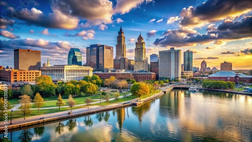 Vibrant cityscape of Cleveland features picturesque lakefront, majestic skyscrapers, and historic landmarks, showcasing the city's rich history, cultural significance, and modern revitalization.