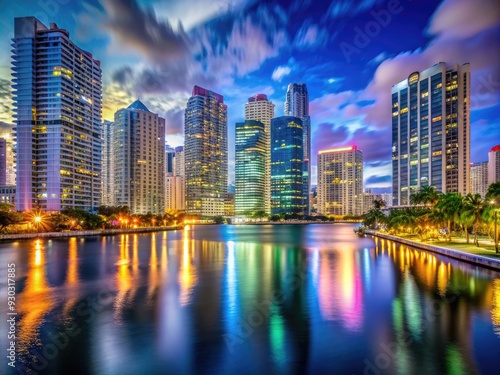Vibrant cityscape of Miami's Brickell district at night, featuring sleek skyscrapers, glittering lights, and tranquil waters of Biscayne Bay.