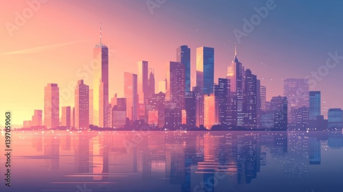 city, skyline, water, sunset, urban, architecture, building, city landscape, twilight, skyscraper, panorama, evening, dusk, scenic, light, modern, downtown, structure, scenery, horizon, view, illuminated, tranquil, peaceful, serene, metropolis, financial, district, facades, landmark, tower, oceanside, waterfront, picturesque, background, graphic, element, illustration, design, decorative, stylistic, artistic