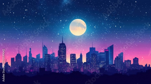 Vibrant Cityscape Under Starry Sky with Full Moon Glow