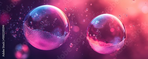 Vibrant close-up of colorful bubbles against a blurred abstract background in shades of pink and purple with shimmering light effects
