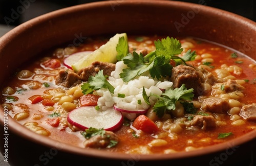 Vibrant close-up of menudo soup in terracotta bowl. Hearty stew features tender meat, hominy, broth, garnished with chopped onions, cilantro, radish, and lime wedge.
