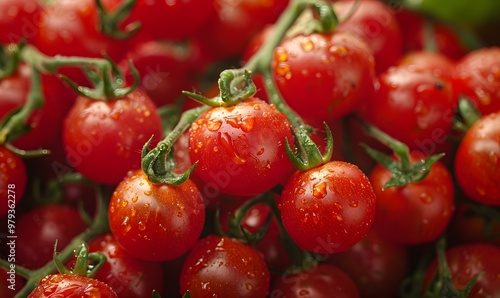 Vibrant Cluster, A detailed close-up of a tightly packed cluster of cherry tomatoes on the vine
