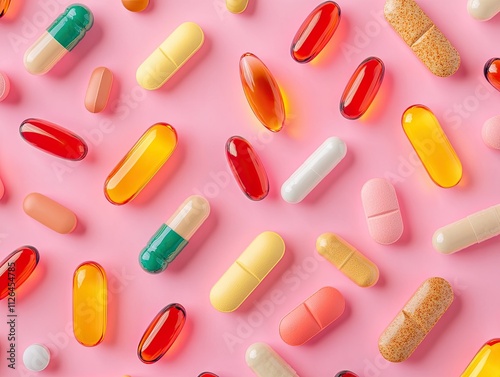Vibrant Collection of Colorful Pills and Capsules Arranged Artistically on Soft Pink Background for Medical and Wellness Themes