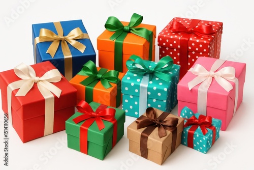 isolated, white background, present, gift, birthday, christmas, holiday, celebration, surprise, wrapping, package, festive, colourful, vibrant, bow, ribbon, assortment, variety, shopping, giving
