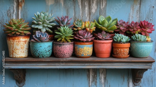 Vibrant collection of succulent plants displayed in diverse pots on a rustic garden shelf, showcasing unique textures and colors.