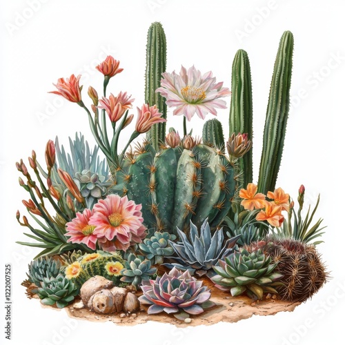 Vibrant Collection of Succulents and Cacti with Colorful Flowers against a White Background