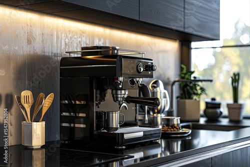 Vibrant Color Picture of Coffee Machine and Kitchen Utensils on Black Countertop