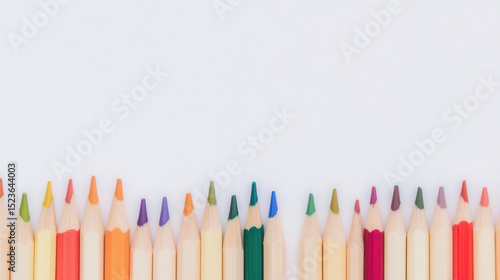 Vibrant colored pencils arranged in symmetrical line, showcasing variety of colors and tips, perfect for artistic expression