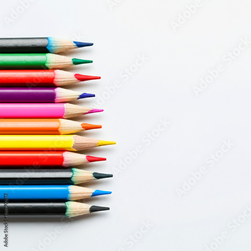 Vibrant colored pencils neatly arranged in a row, sharp tips, isolated on white background.