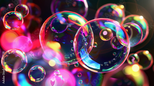 Vibrant, colorful bubbles float against a dark background, reflecting various hues and creating a magical, dreamy atmosphere.
