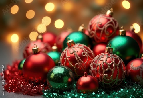 vibrant colorful holiday ornaments sparkling glittery background seasonal festive decorations, bokeh, sparkle, light, pearl, ribbon, gift, celebration