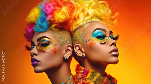 gay, pride, people, person, lifestyle, looking, girlfriend, friends, feminine, female, ethnic, dating, blue, beautiful, background, portrait, playful, studio, style, 2, t-shirt, young, smiling, together, trendy, laughing, fashion, diverse, couple, natural, happy, model, adult, standing, smile, fun, casual attire, attire, confident, pose, modern, copy, space, authentic, carefree, flag, rainbow, generative, ai
