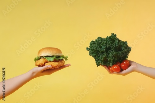 vibrant, contrast, studio, light, burger, fast, food, vegetable, kale, tomatoes, health, choice, minimalist, fresh, diet, lifestyle, nourishment, healthy, eating, decision, visual, comparison, photo, culinary, monochrome, background, isolated, hand, presentation, greener, tomatoes, balance, organic, yellow, concept, nourishment, ingredient, tempting, hamburger, sandwich, bread, lettuce, meal, meat, cheeseburger, vegetable, fast food