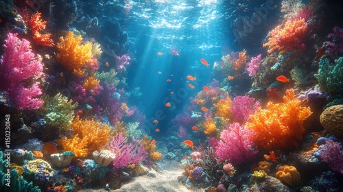 Vibrant coral reef, colorful fish, sunlit ocean.
