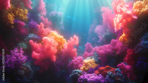 vibrant, coral, reef, illuminated, sunlight, underwater, radiant, illustration
