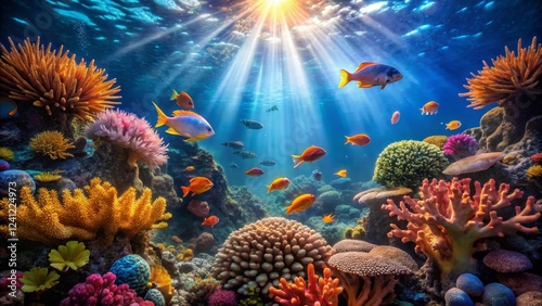 Vibrant Coral Reef Underwater Scene with Colorful Fish and Light
