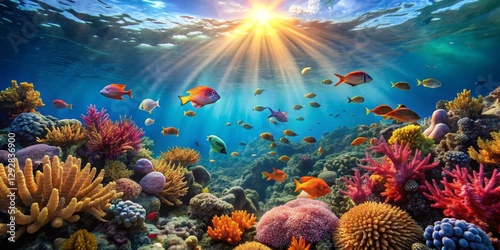 Vibrant Coral Reef Underwater Scene with Colorful Fish and Sunlight