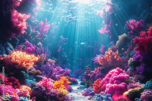 Vibrant coral reef with sunlight streaming through the water, showcasing a variety of colorful coral formations and a few small fish swimming by.