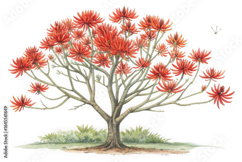 coral, tree, plant, botanical, illustration, watercolor, painting, art, nature, flora, flower, blossom, red, orange, vibrant, tropical, exotic, blooming, leaf, foliage, green, tree branch, trunk, root, ground, detail, realistic, organic, garden, landscape, wildlife, design, element, clip art, isolated, transparent, background, cut-out, white, studio, shot, single, object