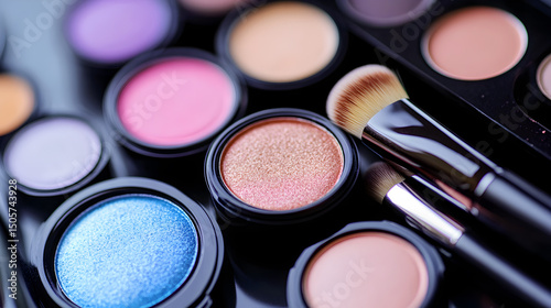 Vibrant cosmetic brushes and an eyeshadow palette burst with colorful beauty, perfect for glamourous makeup application