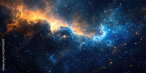 Vibrant cosmic nebula with orange and blue hues, star-filled space background, dynamic swirling clouds on the left and right blending together.