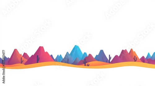 Vibrant Desert Landscape with Colorful Mountains and Cacti Against a Bright White Background for Nature and Adventure Themes
